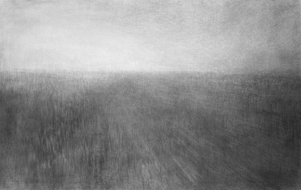 DB: Może rzeczywiście mogłeś się zirytować. W katalogu, w którym są reprodukcje, nie było to w ten sposób opisane. Jednak ja się cieszyłam, że mogłam ten opis stworzyć na nowo do pracy, która powstała w 2017 roku. I właśnie o to mi chodziło. O obieg materii. O materię i światło. Tak naprawdę to była geneza powstania tego rysunku. Jasne, że to brzmi jakby było trochę naciągane, że niby ja to robię na potrzeby wystawy, żeby się wpasować, dla naukowców. Dobra, okej. Może rzeczywiście trochę za dużo tych pojęć naukowych, ale dla mnie tak było, kiedy rysowałam obraz. To jest największy mój obraz, który z racji gabarytów powstawał, gdy byłam sama w domu, żeby dzieci w niego nie ingerowały. Chciałam zrobić pejzaż z próbą pokazania tego, co odczuwam wobec przyrody, właśnie wobec światła i jego oddziaływania. W pewnym momencie poczułam jakiś zachwyt, że to wszystko, że to tak działa w przyrodzie, że jest jakiś ruch. Tak naprawdę w życiu jest ciągle ruch, wszystko jest w ruchu. Chciałam stworzyć obraz, który miałby konotacje z tkanką fotograficzną, materią powstałą w procesie chemicznym. Opis jest więc tendencyjny, zgadzam się, ale jednocześnie mówi faktycznie o genezie tego rysunku, o moich intencjach.
