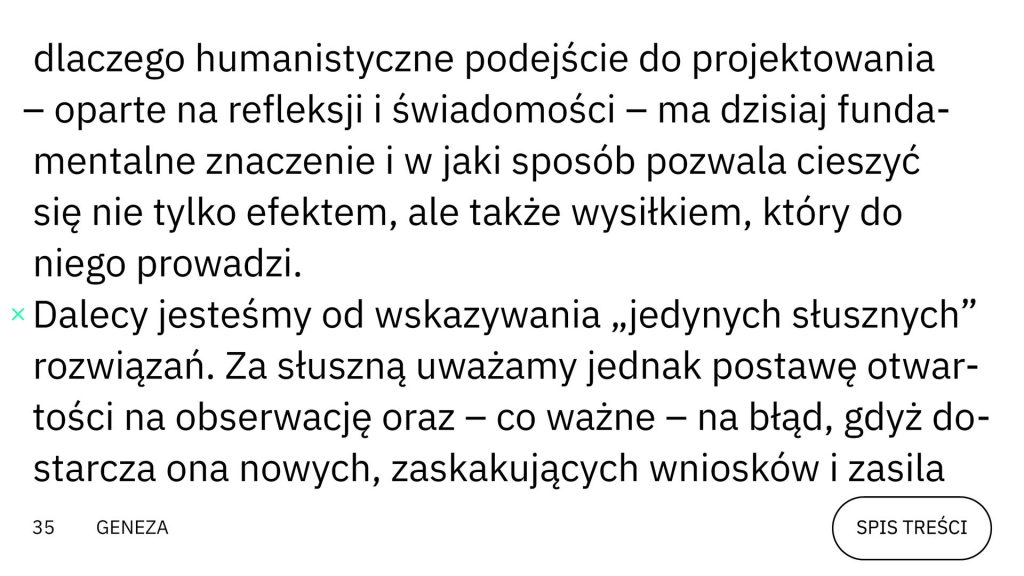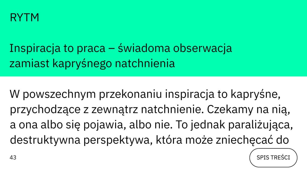 Tak jak w procesie twórczym, narracja publikacji łączy kontrasty – filozoficzne refleksje o źródłach inspiracji [s. 43–52, „Inspiracja…”] idą w parze z analizą logiki projektowania graficznego [s. 54–59, „Projektowanie humanistyczne”]. Autorzy ukazują projektowanie jako dyscyplinę intelektualną i humanistyczną, nierozerwalnie splatającą umysł, ciało i materiał – to nie estetyzacja czy sama technika, lecz aktywna obserwacja, odpowiedzialne decyzje i transformacja zastanej sytuacji w oczekiwaną.