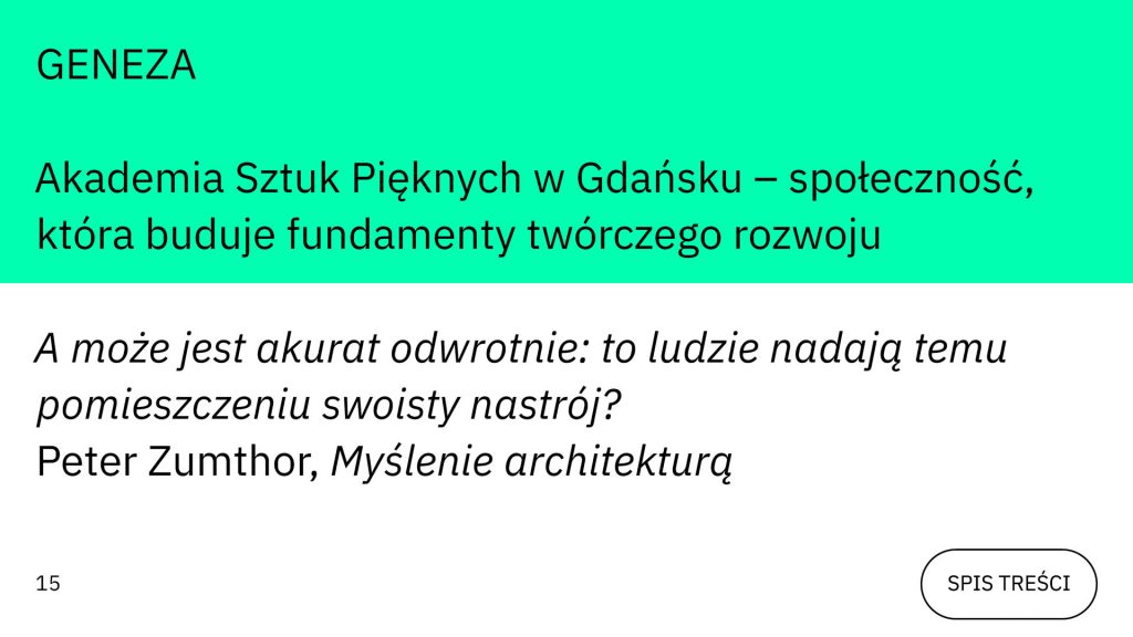 Miejsce podręcznikowych definicji zajmuje subiektywne spojrzenie na proces – autentyczne i osobiste, mające swoje źródło w kolektywnym doświadczeniu społeczności Wydziału Grafiki ASP w Gdańsku [s. 15–32, „Geneza”]. Pełna lista dydaktyków i ich prace ilustrujące wydawnictwo stanowią manifest żywej wspólnoty, trwałej wobec technologicznych przemian. Dzięki temu rozważania zawarte w publikacji stanowią naturalne zaproszenie do akademickich pracowni, oferując jednocześnie plan działania i miejsce realizacji.