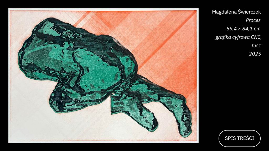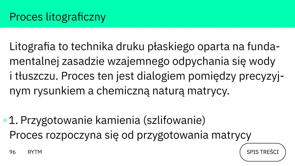 Dlatego wracamy do pracowni Wydziału Grafiki na kolejną praktyczną lekcję. Publikacja poświęca litografii centralną rolę – osiemnastowieczna technika druku płaskiego, oparta na fizycznym zjawisku odpychaniu wody i tłuszczu, jest modelem świadomego działania i pokory [s. 88, „Litografia…”]. Patrycja Podkościelny pokazuje ją krok po kroku jako „dialog precyzyjnego rysunku z chemią matrycy” [s. 96, „Proces litograficzny…”]. Ten tutorial staje się metaforą procesu twórczego: szlifowanie kamienia przygotowuje umysł, trawienie kwasem uczy akceptacji błędu bez cofania. Gdy dziś zawód: grafik oddala się od drukarza w stronę informatyka[9]Dunderpedia (The Office Wiki), „Nick” – zatrudnienie: IT Guy, wcześniej Graphic Designer, https://theoffice.fandom.com/wiki/Nick, dostęp: 28.01.2026., warto wracać do źródeł profesji – nie z tradycjonalizmu, lecz po czyste doświadczenie myślenia graficznego i matrycowości.