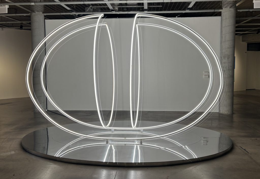 Pracą natychmiast przykuwającą uwagę widzów była świetlna instalacja rzeźbiarska autorstwa Karoliny Hałatek, składająca się dwóch świetlistych elips, których światło odbijało się na lustrzanej podłodze. Jest to realizacja, w stronę której automatycznie podążała publiczność zaraz po przekroczeniu progu galerii, co oczywiście tymczasowo zmieniało kierunek zwiedzania. Jednakże praca ta, stwarzająca intymną przestrzeń głębi, a tym samym intensywnego, bardzo wsobnego doświadczenia, sprzyjała budowaniu kontemplacyjnego nastroju, dzięki czemu można było doświadczyć ekspozycji wszystkimi zmysłami. I oto też w niej tak naprawdę chodziło.
