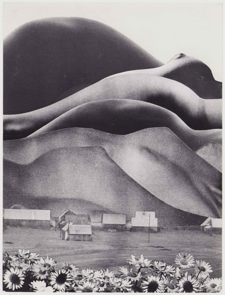 Wystawę zamyka fotografia Zofii Rydet z połowy lat 70’. Ten antropomorfizujący pejzaż, bukoliczno-arkadyjska przestrzeń odnosi się z jednej strony do wioski – miejsca, w którym zamyka się cały makrokosmos, z drewnianymi domkami i uginającymi się od nasion słonecznikami, a z drugiej do quasi erotycznego, nagiego ciała, drzemiącego albo śniącego gdzieś w trawie. Ciała i ciał, które stają się pejzażem: nakładają się na siebie, łączą z ziemią, zrastają z korzeniami i wrastają w góry. Nie bez powodu Silvia Federici pisała, że dla kapitalizmu ziemia i ciało to taki sam zasób, to nie tylko narzędzie, ale też teren produkcji i pole nieustającej eksploatacji[2]Zob.: S. Federici, Kaliban i czarownica. Kobiety, ciało i akumulacja pierwotna, przeł. K. Król, Kraków, 2025.