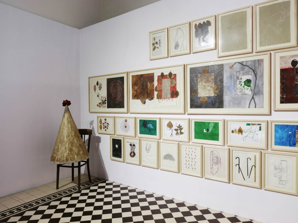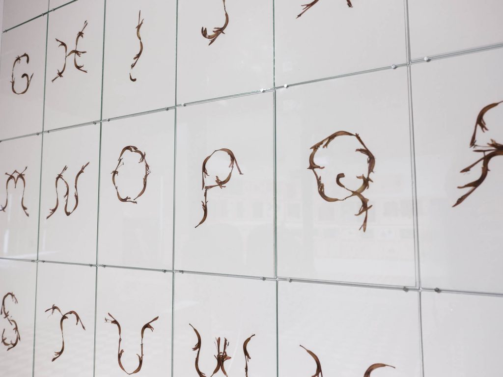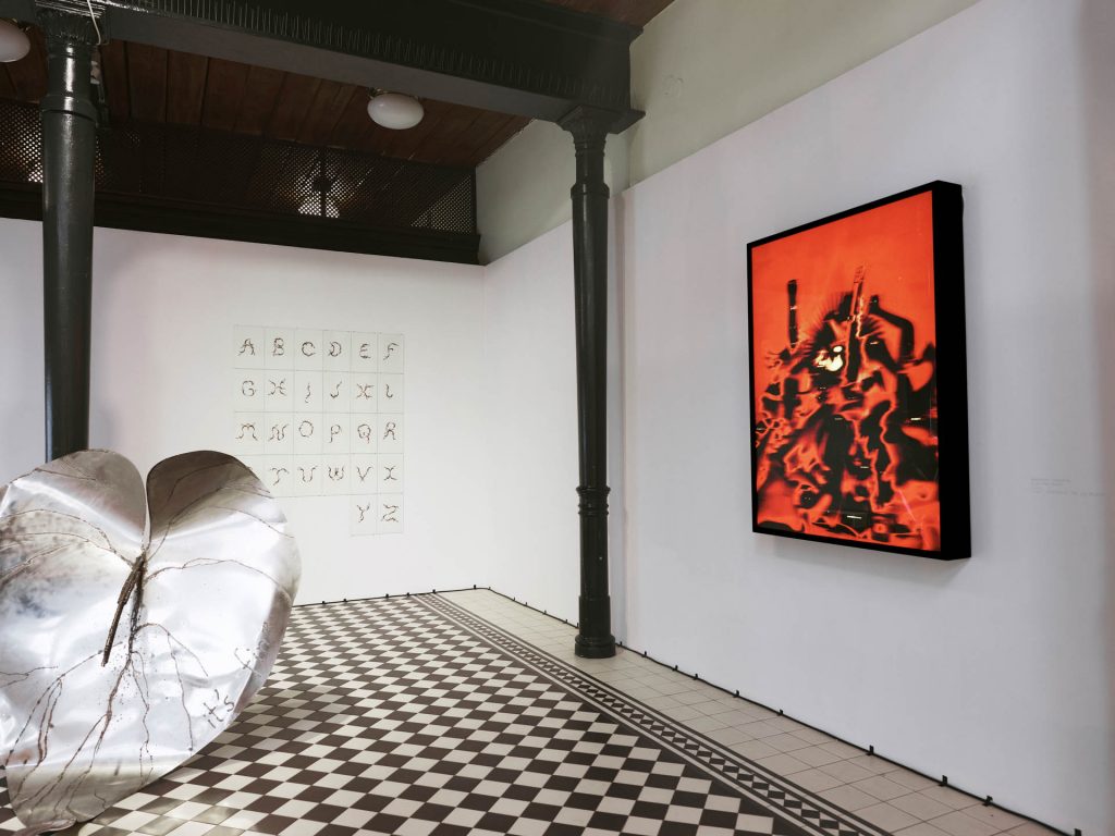 Refleksję nad językiem i niewerbalnymi sposobami komunikacji otwiera monumentalna instalacja Marka Chalndy. Szczelnie wypełniające całe ścianki ciągi rysunków i dwa stożkowate kształty przypominające szamańskie kapelusze to fragment pracy Kodeks nadwiślański, która składa się prawie z 200 elementów. To gra ze znakiem i jego znaczeniem, śledzenie powtarzalnych, wciąż transformujących się motywów, mierzenie się ze słowem „kodeks”, który oznacza księgę, tablicę, ale też spis praw i pień drzewa. Rysunki wykorzystujące fragmenty zasuszonych liści korespondują z pokazywanym naprzeciwko Alfabetem Przemka Branasa, stworzonym z zielnika, kwiatów trującej rośliny chasmanthe floribunda, który z kolei może być czytany jako komentarz do odwiecznej dialektyki natury i kultury, ale też krytyczny przypis do botanicznej historii kolonializmu i związanej z nią migracją roślin. Nawiązuje również do sąsiednich obiektów Magdaleny Lazar. Praca ta ma formę wielkich srebrnych kwiatów. To para anturium, roślin pochodzących z Ameryki Południowej, które w swojej formie są rozerotyzowane, bezwstydne, a nawet kiczowate i wulgarne. Na jednej z nich artystka umieściła napis „Its fine”, na drugiej „Its fucked”. Praca odsyła nas nie tylko do znanej od średniowiecza florystyki symbolicznej, systemu przypisywania znaczeń poszczególnym gatunkom, kolorom i liczbom kwiatów, ale też do kodów kulturowych. O ile bowiem w Polsce anturium wiąże się z uroczystościami żałobnymi – wieniec tych kwiatów pojawia się zresztą w czasie pogrzebu na wideo Łukasza Murzyna – o tyle w tzw. krajach łacińskich są one symbolem miłości i namiętności, seksu i erotyki.