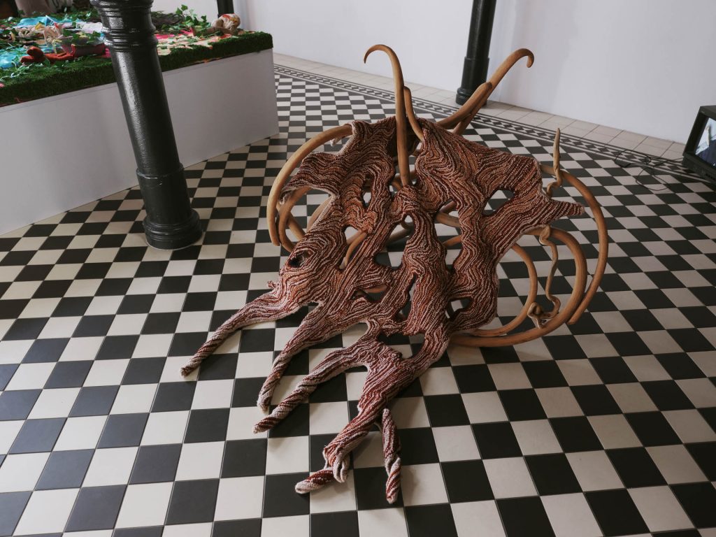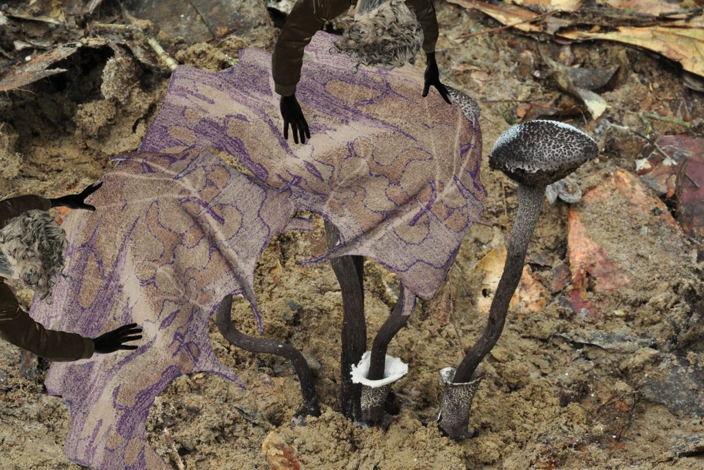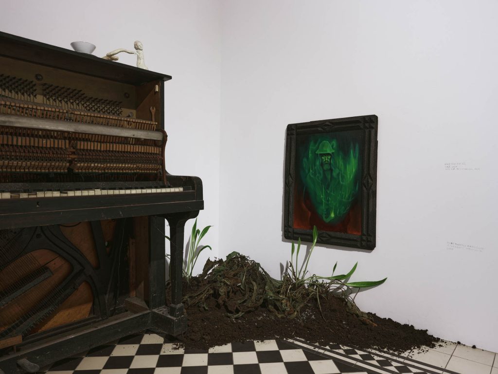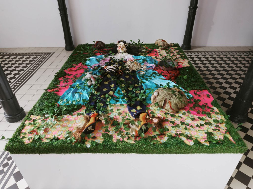 Na wystawie pokazujemy pracę Mirona Białoszewskiego, Filmikowanie z lat 70, groteskowe, odgrywane przez poetę i jego przyjaciół scenki i skecze w estetyce niemego filmu, których scenariusze opierały się, jak głosi legenda, na zapamiętanych snach. Na jednym z nich Białoszewski z mopem na głowie, tańcząc w transie odgrywa rolę szamana, na innym zatytułowanym Sekretarka maszynistka rytmicznie wystukując słowa pisze nie na maszynie, ale na pończosze. Albo jeszcze taka scena z filmiku zatytułowanego nomen omen Sen Mirona: „Miron śpi, ale czuje też pragnienie. Podchodzi do niego chłopak ze szklanką napełniona wodą. Tuż przed tym jak Miron ma ją chwycić, szklanka upada, a woda rozlewa się. I jak we śnie, który nie chce przestać się śnić, motyw upadającej szklanki uporczywie powraca”[1]Filmikowanie, [w:] Topo-Grafie. Uniwersytet Warszawski, [online:] http://topo-grafie.uw.edu.pl/miron/zoliborz/filmikowanie/, dostęp: 24 października 2025. Filmikowanie było przede wszystkim zabawą, realizowaną przez grupę zaprzyjaźnionych ze sobą osób, której efektów prawie nigdy nie oglądano, bo wywoływanie taśmy było zbyt drogie. Ta surrealistyczna atmosfera, łącząca absurd z oniryczną aurą zdaje też dobrze korespondować z trzema fotografiami Marty Niedbał z serii Nocne praktyki oporu. Kolaż z grzybami i czarnymi, wyciętymi w formie sylwetki rękami, zestawiony został z dwoma przedstawieniami śpiącego mężczyzny. Na jednej z fotografii widzimy zbliżenie na twarz i kryjącą się w dziurce od nosa pomniejszoną postać dziewczyny, na drugiej ten sam chłopak przykryty jest czymś, co przypomina dziurawy gobelin. Ten motyw zresztą też powraca, trochę jak dręczące deja vu, w innej pracy Niedbał. Apnea (The Messenger) to rzeźba z drewna i wełnianej tkaniny, na pierwszy rzut przypominająca bujany fotel z kocem przeżartym molami, której tytuł odsyła do bezdechu, okresowego zatrzymania oddychania podczas snu i co za tym idzie, stanu chwilowego zawieszenia. Jednocześnie jego podtytuł znaczy też tyle co zwiastun albo symptom – koduje wiadomość, strukturę pośredniczącą między znaczeniem a znakiem. Fotel może też być miejscem czuwania. Zwłaszcza, że tuż obok pokazywany jest obraz – katafalk. To praca koreańskiej artystki Si On. Dwa przytulone do siebie kościotrupy, pani i jej piesek, porośnięte plastikowym bluszczem i zjadane przez kolorowe dżdżownice – żelki Haribo to refleksja nad bajką o śpiącej królewnie, krytyczna próba odczarowania jej patriarchalnej ale też rasowej wymowy, utrwalającej przemocowe normy i narzucone role społeczne. Biała jak śnieg skóra, nieprzemijające piękno i pasywność, kobieta czekająca na ratunek, na męską obecność, która na powrót przywróci ją do życia i wreszcie pocałunek, na który nikt nie wyraził zgody. W medycynie syndrom śpiącej królewny to zaburzenie neurologiczne, objawiające się okresami wzmożonej senności. Jak przypuszczają badacze to reakcja na traumatyczne wydarzenia, ale też eskapistyczne odcięcie się od życia. Ale może też właśnie przeniesienie się z życiem gdzie indziej?